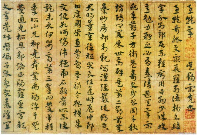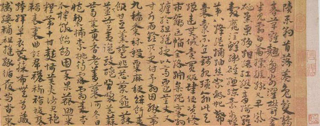 宋克,1327年生,1384年逝世,吴郡长州(今苏州市吴县)人。明代书家。字仲温,一字克温,自号南宫生。。官至凤翔同知,是明代初期闻名于书坛的书法家“三宋二沈”之一。(三宋指:宋克、宋广、宋璲,二沈指:沈度、沈粲)。一生潜心习书,寒暑不辍,遂以擅书名天下。吴宽《匏翁家藏集》谓:“宋克书也魏晋,深得钟、王之法,故笔精墨妙,而风度翩翩可爱。”宋克善小楷,尤精章草,传世墨迹有章草《急就章》、《公讌诗》、《七姬志》等。《急就章》,宋克书于洪武丁卯(1387),纸本墨迹,每行字数不一,共149字。纵13.8厘米,横232.7厘米。故宫博物院藏。宋克所书急就章,不只一本,现存的就有故宫藏本和天津艺术博物馆藏本。就故宫博物院藏本而论,行笔劲健,章法严密,首尾相顾,气势相连。其笔法十分流畅,行、草相杂,变换自然,笔势翩翩,笔意古雅。粗犷的波脚与瘦劲的笔画巧妙结合,相映成趣,确实给人以“结意纯美”之感。较之赵孟頫所临《急就章》更为生动精采,富有感染力,又具有今草的灵性、跌宕的艺术情趣。这是章草发展到宋、元以后而形成的新风格。